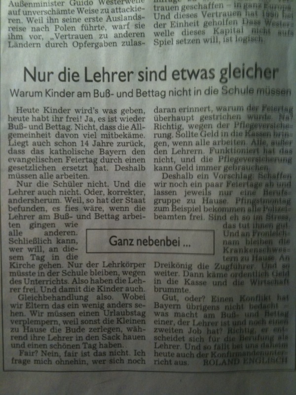 Zuerst der Kernpunkt: Herr Roland Englisch behauptet – garniert von Herabsetzungen eines ganzes Berufsstandes, dass die Lehrer heute (Mittwoch) frei hätten – dies ist natürlich falsch. Herr Englisch kann nicht zwischen „Unterrichtsfrei“ und „Ferientag“ unterscheiden. Zwar hätte er dies binnen 1min „Google“ erfahren können, jedoch darf wohl heute ein Journalist ungeprüft seine Gedanken in der NN veröffentlichen, ein Skandal!