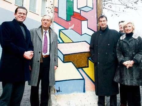 Ein zwei Tonnen schweres Berliner Mauerstück erinnert seit Samstag, 12.12.09, in der Nürnberger Altstadt an die vor 20 Jahren überwundene deutsche Teilung. Die einseitig mit Graffiti bemalte Betonwand sei ein «Mittel gegen das schleichende Gift des Vergessens», sagte Bundesverteidigungsminister Karl-Theodor zu Guttenberg (CSU) am Samstag bei der Enthüllung des 3,60 Meter hohen Mauerteils.