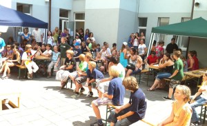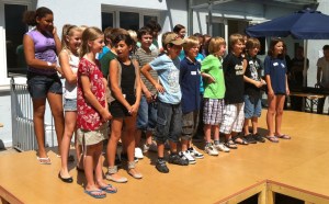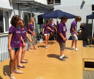 Heute war schon wieder voll was los bei uns. Die aktuellen Fünftklässler haben die künftigten „Kleinen“ mit einer Bühnenshow begrüßt. Dabei war auch der Chor, der die neue Sabel-Hymne von Herr Mulzer vorstellte. Danach gings weiter mit der Theatergruppe, die ein interessantes Stück (Romeo und Julia) aufführte, zusätzlich gabs eine Sketch in englischer Sprache, den Frau Freund mit den Schülern einübte. Richtig zur Sache ging es dann mit der Hip-Hop-Mannschaft, die zu kräftigen Beats auf der Bühne schwitze – es war ja in der Sonne auch fast 50 Grad warm…