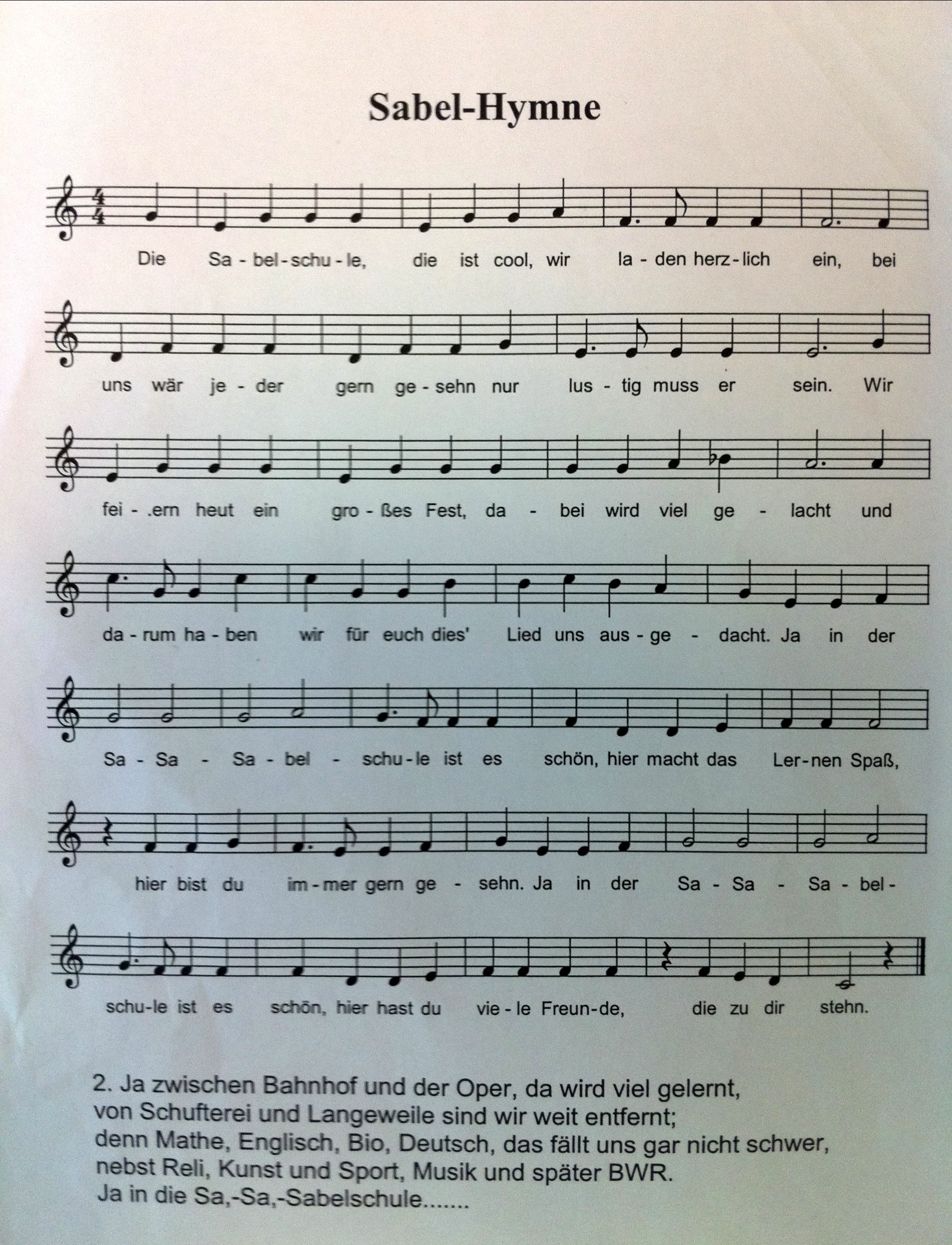 Zusammen mit ihrem Musiklehrer hat sich die R5b (Ideen dazu kamen auch aus der R6a) eine Sabel-Hymne ausgedacht. Herr Mulzer hat sie eingeübt und zum Sommerfest war der Song das erste Mal auf der Bühne. Nun können wir uns vor Anfragen nicht mehr retten, Take That, Lady Gaga, Madonna, Jan Delay, Nena, ACDC, sie alle wollen das Lied nicht singen, aber die R5b hat extra für Sabelino nochmal eine Aufnahme erstellt, aus technischen Gründen als Video mit Standbild, ging hier leider nicht anders.