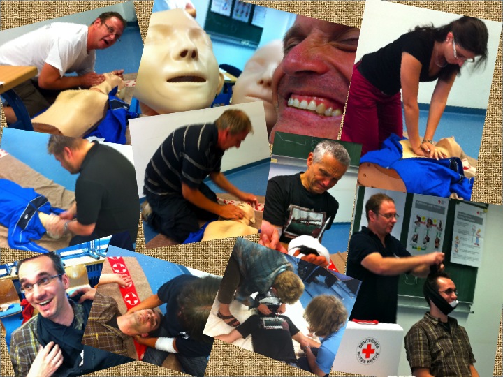 Endlich lüften wir das Geheimnis: Was machen Lehrer in den Ferien? Antwort: Erste Hilfe Kurs! An unserer Power-Schule ist ja immer mächtig etwas los, da kann man natürlich nie ausschließen, dass mal ein Schüler hinfällt und böses Aua hat. Damit die Lehrer alle kleineren und größeren Wehwehchen sicher und richtig versorgen können, hat unser Herr Schosser direkt in der ersten Ferienwoche zu einer entsprechenden Schulung geladen. An zwei Tagen wurden wir fitt gemacht und können nun mehr als nur ein Pflaster perfekt aufkleben. Und das wir dabei auch etwas Spaß hatten, kann man sicher an den Fotos sehen, oder?