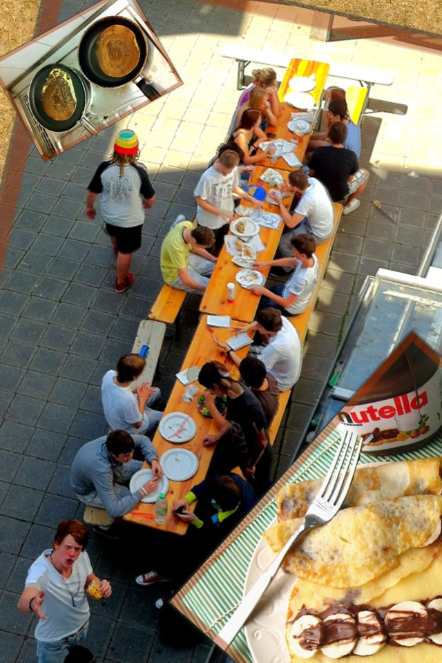 Als Klassenleiter parkte ich mich in die winzige Küche in zweiten Stock und legte auf zwei Pfannen los. Schnell war es in der Nische gefühlte 100 Grad warm, dafür gab es auch alle 2mi frische Pfannkuchen. In gemütlicher Runde wurden gefuttert bis nach einer Stunde alle halbwegs satt waren. Auch die Aufräumarbeiten verliefen ohne größere Proteste, somit konnte unsere kleine Party locker in 90min abgeschlossen werden.