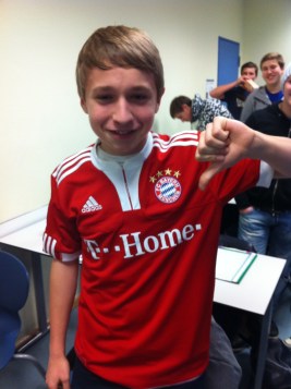 Ein Tag im Bayern-Trikot… schlimmste Ausschläge bildeten sich sofort auf seinem ganzen „Körber“, er verfiel mehr und mehr in den oberbayrischen Dialekt, kaufte die besten Schüler aus anderen Klassen zusammen und wandelte die ersten beiden Tischreihen in VIP-Sitzplätze um. Kurz bevor er den Klassenleiter entlassen wollte, holten wir ihn wieder aus seinem Bayern-Trikot. Seine letzten Worte waren „nie mehr vergess ich die Brezn, ehrlich“… dann sah er sich die Tabelle der 2.Bundesliga an und fragte sich, ob er nächste Saison wirklich zum Auswärtsspiel nach Paderborn mitfahren sollte…