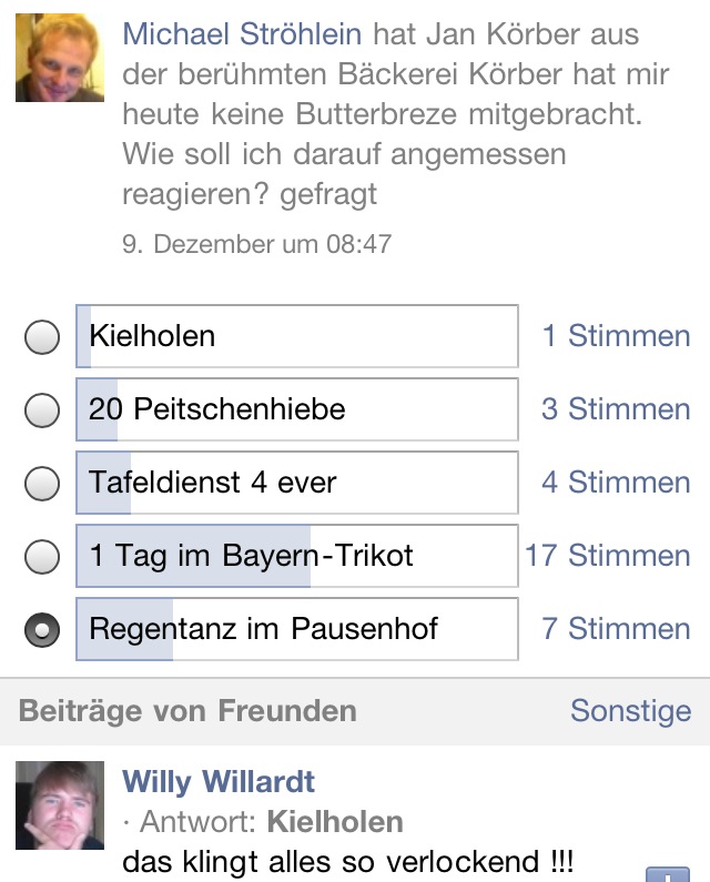 Nichts – sein Platz war leer! Jan K. hatte mit voller Absicht zuerst Herrn Vorragend schwer abhängig gemacht von seinen Butterbrezn – und dann hat er einfach keine Breze mitgebracht. Herr Vorragend war außer sich vor Wut, er schrie die unschuldige Kaffeemaschine an und setzte sich schließlich zur Ablenkung vor Facebook, um seine FB-Gemeinde entscheiden zu lassen, welche gerechte Strafe es nun sein soll für Jan.