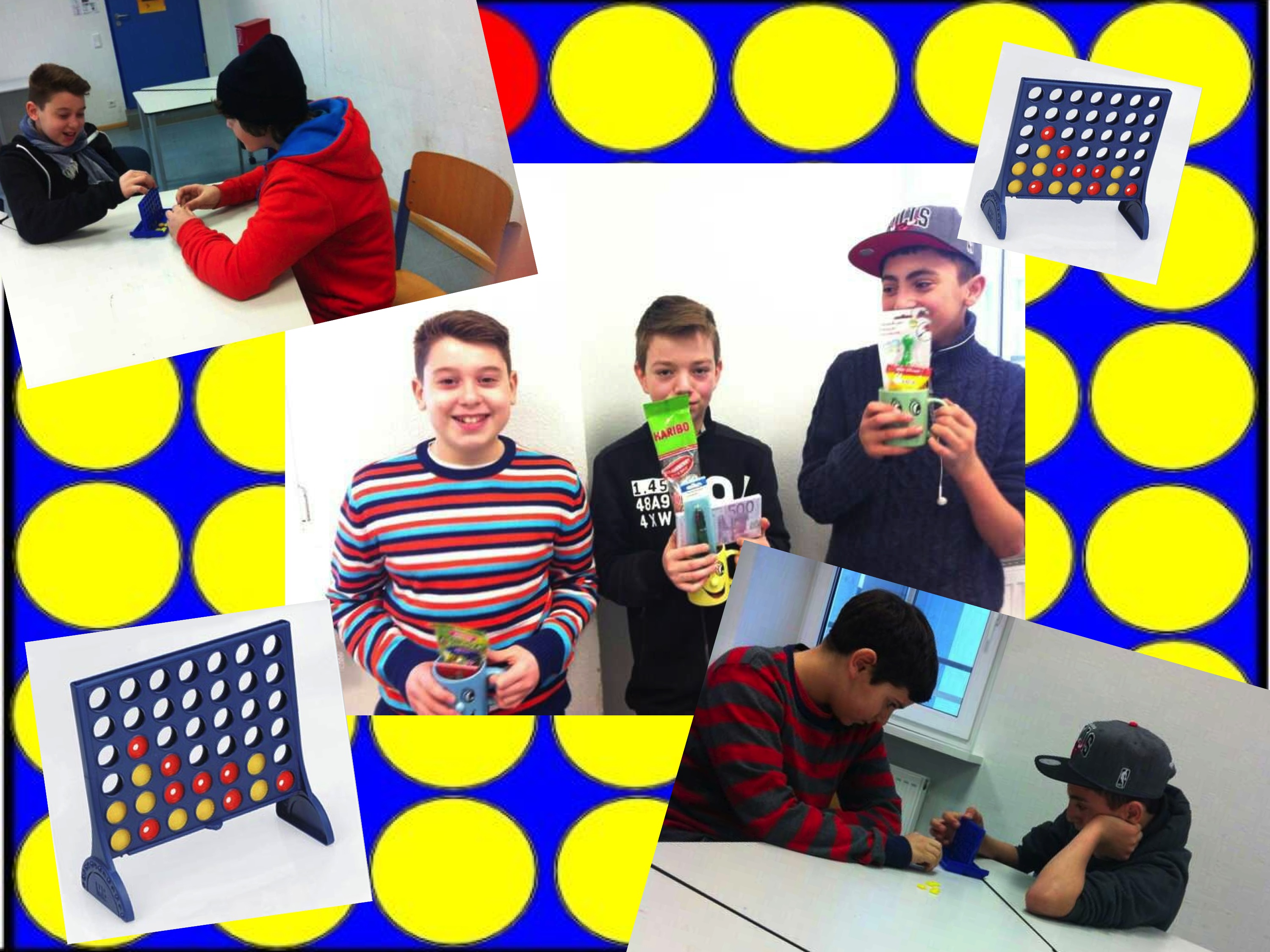 Auch 2013 fand das 4-Gewinnt-Turnier wieder statt, mit am Start waren Schüler der 5-7. Klasse. Es wurde fast jeden Tag in den Pausen gespielt, eifrig angefeuert und mitgefiebert. Im Zwischenraum des 1.Stocks wurde in den Pausen auf die 4-Gewinnt-Spiele gewartet und schon gings los…