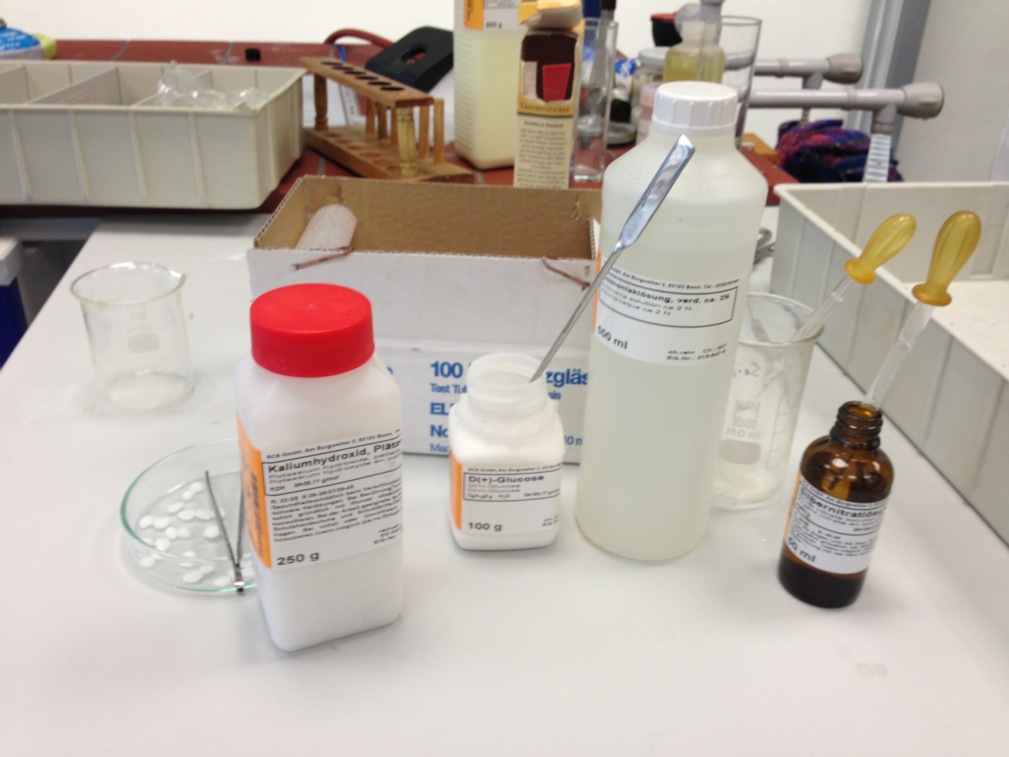 Das Reagenzglas wird mit Silbernitratlösung und Ammoniak gefüllt, dann wird das ganze kurz geschüttelt, man gibt noch eine Spatelspitze Glucose dazu und ein Kaliumhydroxidplätzchen…