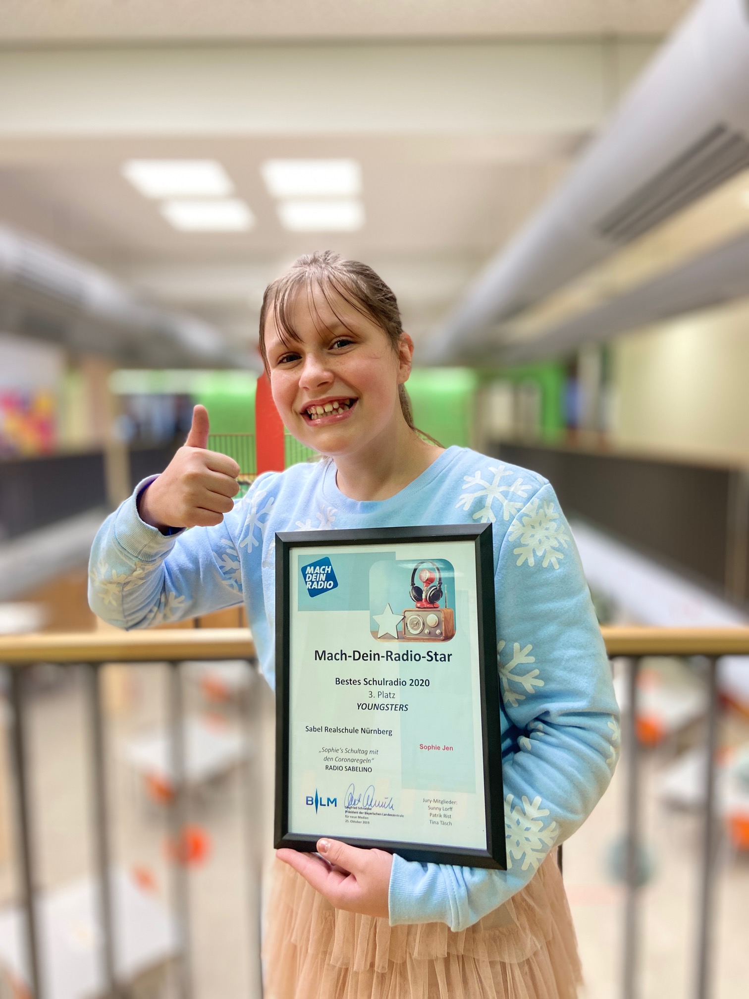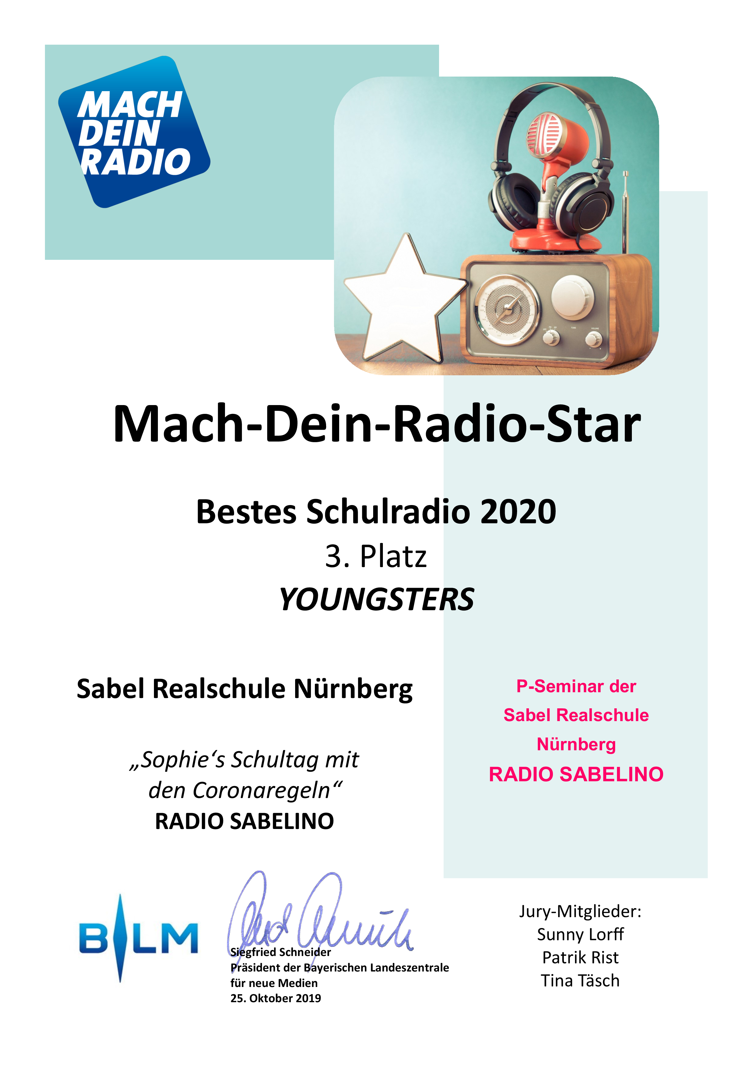 Am letzten Schultag vor dem Lockdown hat uns eine tolle Nachricht erreicht. Bei dem Wettbewerb „Mach dein Radio Star 2020“, veranstaltet von der Bayerischen Landeszentrale für neue Medien, hat Sophie aus der Klasse R5b mit ihrer ersten Reportage zum Schulalltag mit Corona direkt den 3. Platz in Bayern geholt. Diese Urkunde gabs für sie und unser Schulradio-Team: